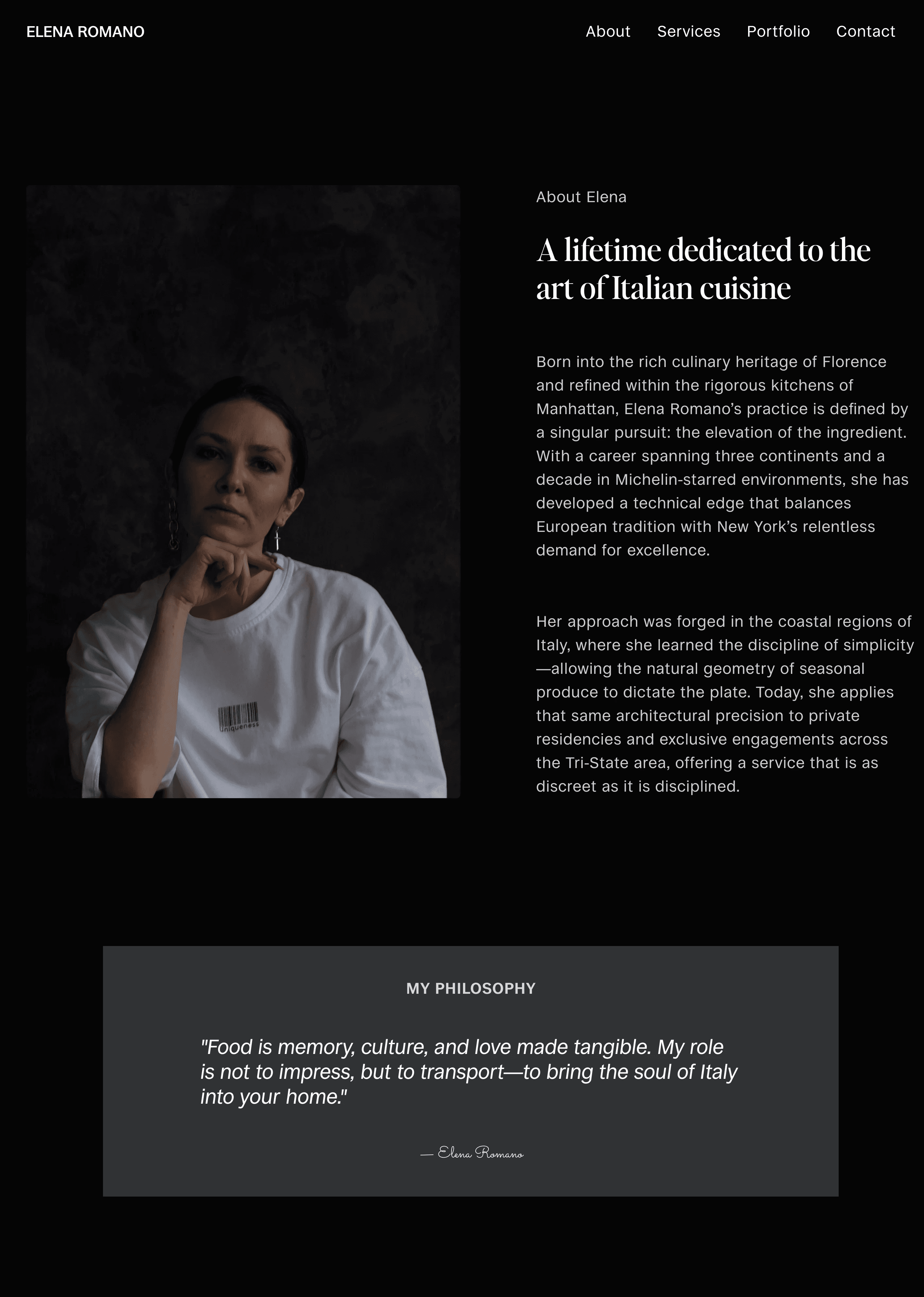 Elena Romano is a concept website for a private chef, designed to reflect intimacy, personalization, and refined culinary experiences.